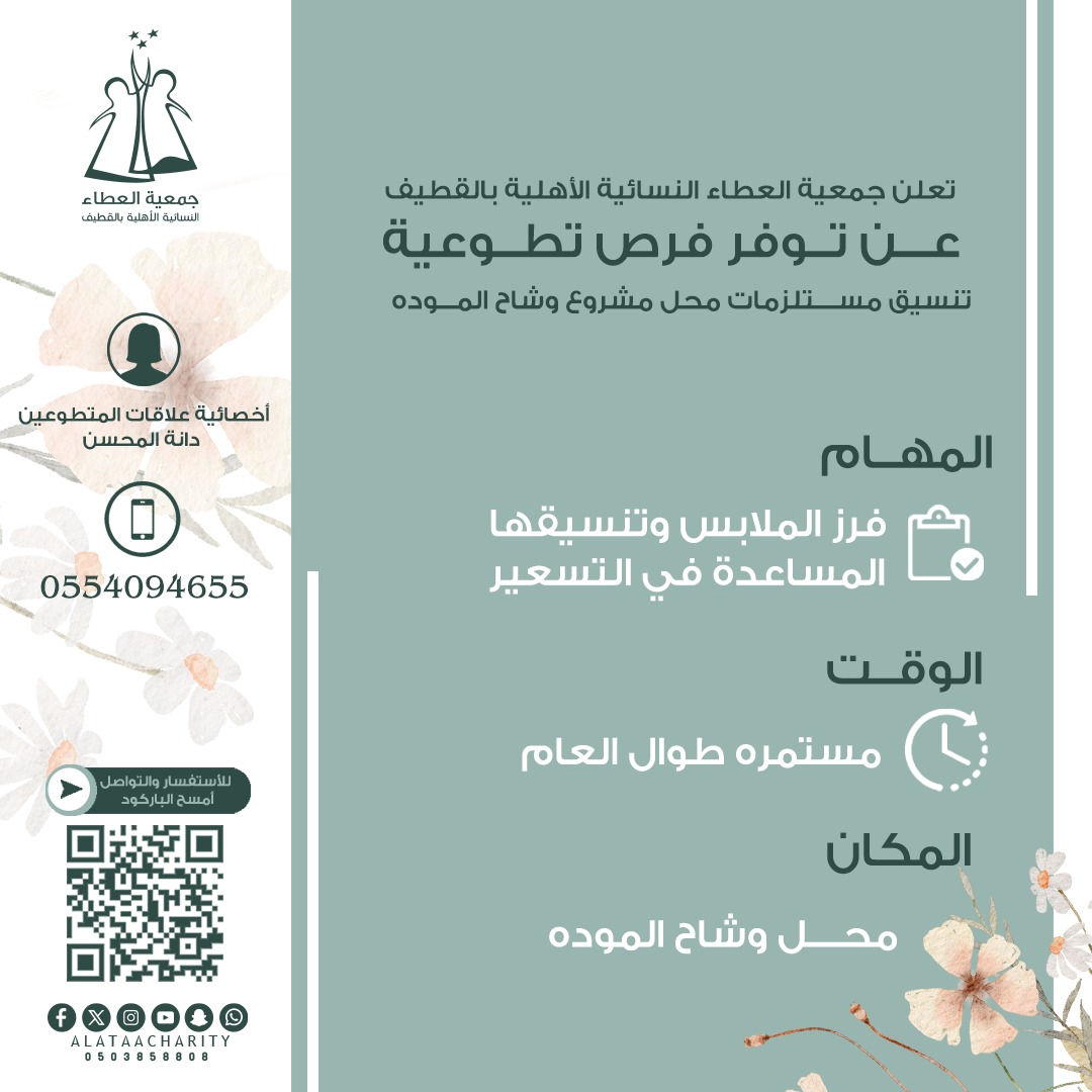 تعلن جمعية العطاء النسائية الأهلية بالقطيف عن وجود فرصة تطوعية بمسمى